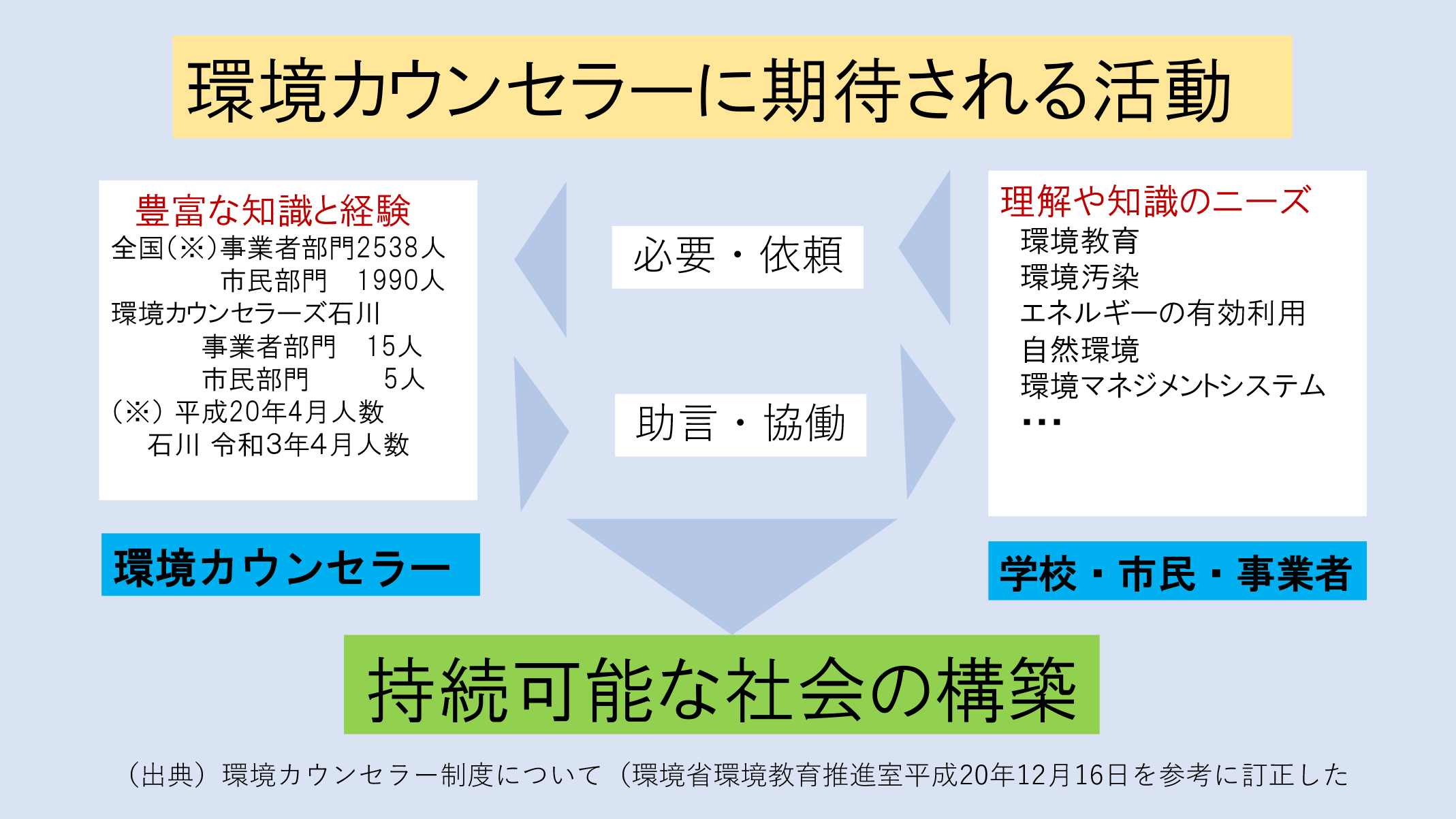 環境カウンセラーは、環境省が豊富な環境の知識や経験を認め、登録された人の呼称です。市民部門と事業者部門に区分されており、石川県内では、20人で「環境カウンセラーズ石川」を構成しています。