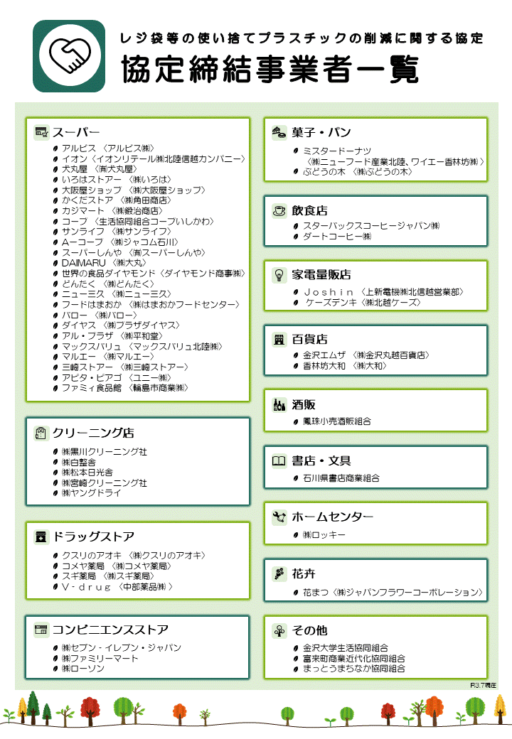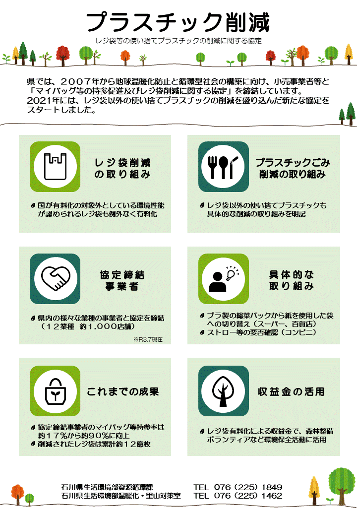 石川県では、全国に先駆けて、平成19年度より、県内の食品スーパー等の小売事業者と「マイバッグ等の持参促進及びレジ袋削減に関する協定」を締結し、平成21年度からは、スーパー・クリーニング店でレジ袋を有料化するなど、レジ袋削減を積極的に推進してきました。