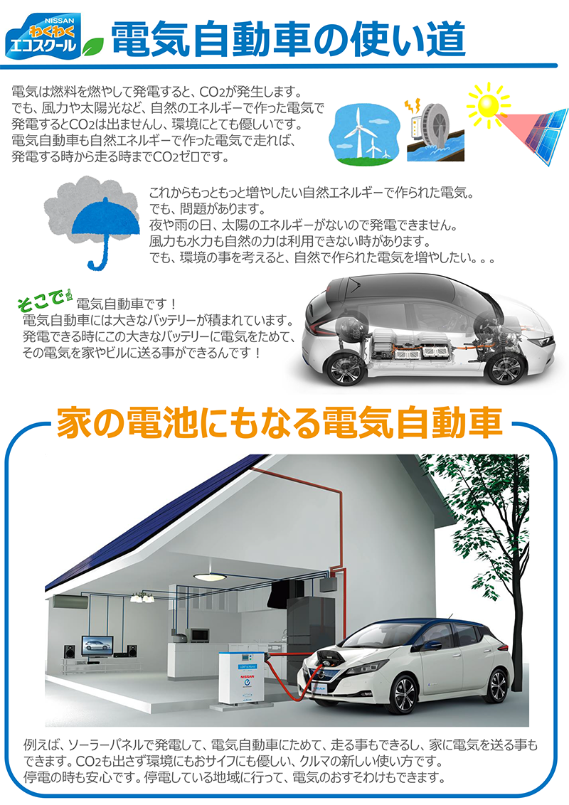 次に、作るときにCO₂を出さない自然エネルギーによる発電を増やすため、蓄電池として電気自動車を利用すること。