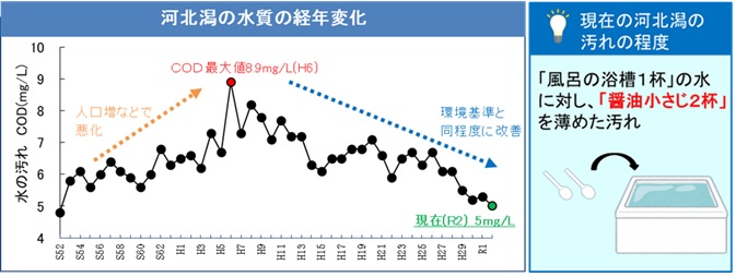 河北潟のCODは、ピーク時の平成6年には1リットルあたり8.9ミリグラムでしたが、水質改善に向けた取組により徐々に改善し、現在(R2年度)は5ミリグラムまで改善しています。