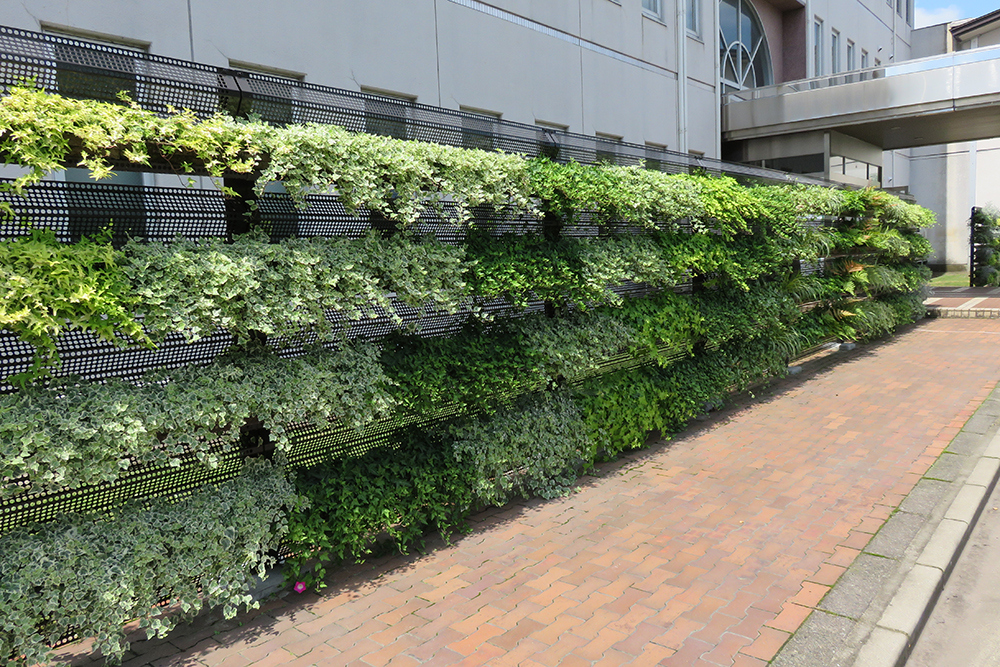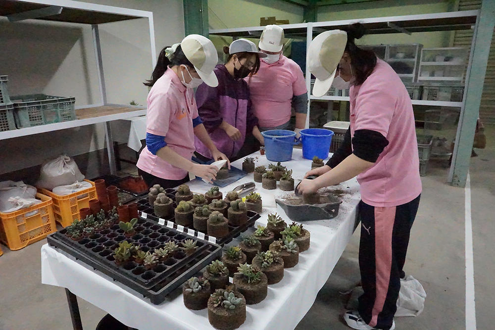 環境事業部では、3R対応の保水セラミックスを活用した屋上緑化・壁面緑化・軌道緑化の施工で55,000㎡以上の実績があり、CO₂削減やヒートアイランド現象抑制等に貢献しており、国土交通大臣賞や環境大臣賞など多くの評価をいただいています。加えて、2021年11月より、社会福祉法人南陽園様とのパートナーシップで3R対応のエコ緑化素材を使って多肉植物を寄せ植えするなどして手作りした新商品・植彩インテリア「Buddy(バディ)」を商品化しました。「Buddy」には、障がい者と健常者が「相棒」として支え合うという意味が込められています。生産加工~梱包までの一連の仕事を障がい者の方々に委託し、障がい者が活躍できる地域共生社会の実現を願いに取り組んでいます。